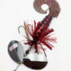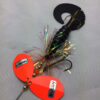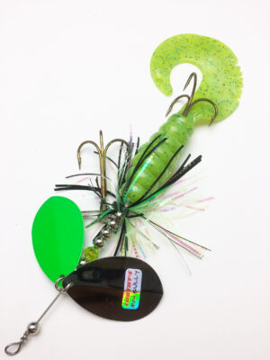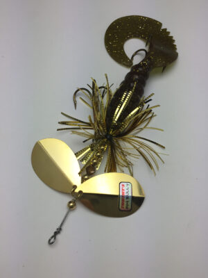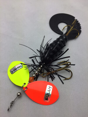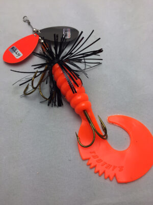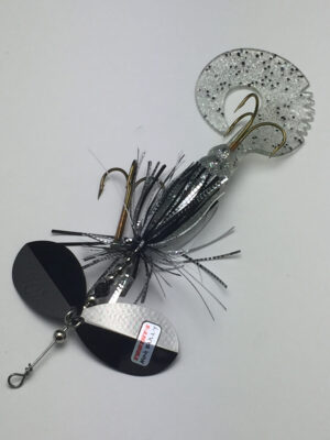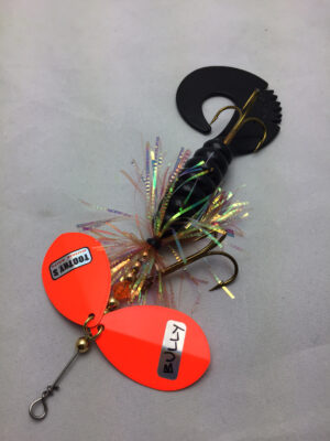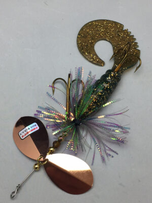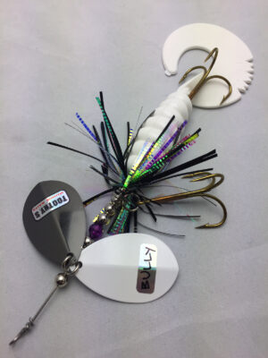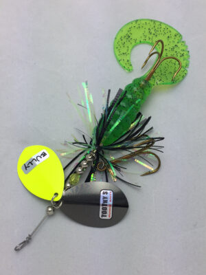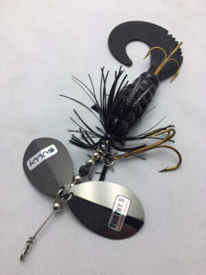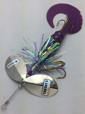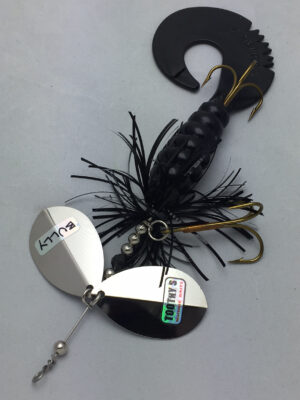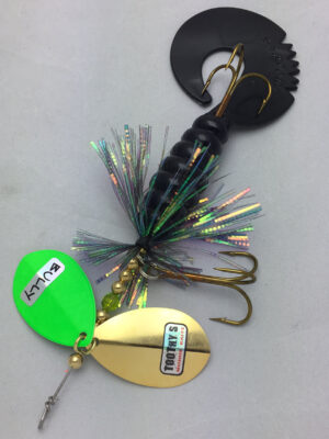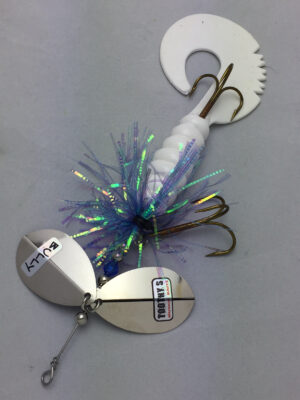 The Mini Bully is a downsized version of the popular Bully. The Mini Bully is 2.7 oz and 9″ long (10″ long with tail extended) Built with #8 Toothy Custom Blades and a hand poured grub tail. The combination of flash skirt and rubber grub tail drives muskies crazy. This smaller size is going to be a great addition to your musky fishing arsenal.
