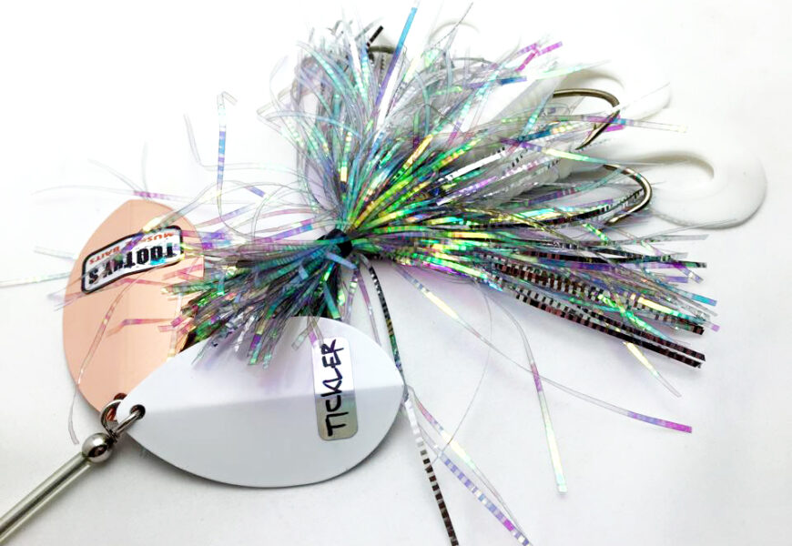 In recent years, large double-bladed muskie bucktails have taken over the minds of anglers and manufacturers. While several companies make bucktails with blades beyond the #10 size, few have utilized creativity and engineering to build a new concept for hooks and trailers. Enter the Tickler by Toothy’s Tackle, that adds thickly cut, crinkle mylar skirts and highly reflective beveled blades that give off a level of light, reflection and vibration unlike any other big bucktail on the market. Nobody else has a blade anything like this. On this bait, the Tickler’s synthetic skirt flares out more due to individual curly-tail trailers attached to three single hooks. Toothy’s Ticklers give big blade fishermen an option that on certain days a unique skirt and trailer material may be a more important triggering effect on muskies than blade size.